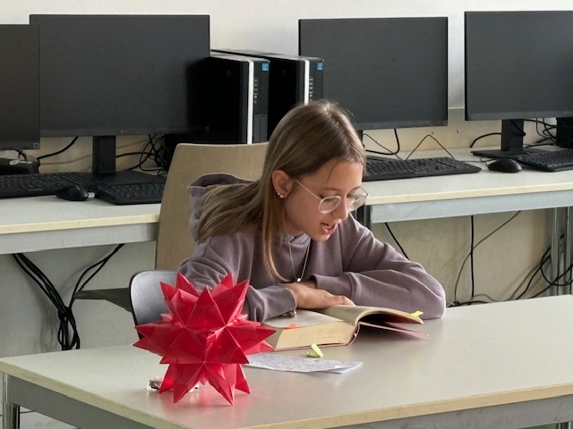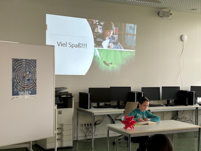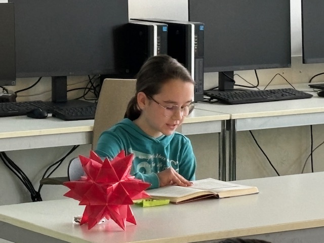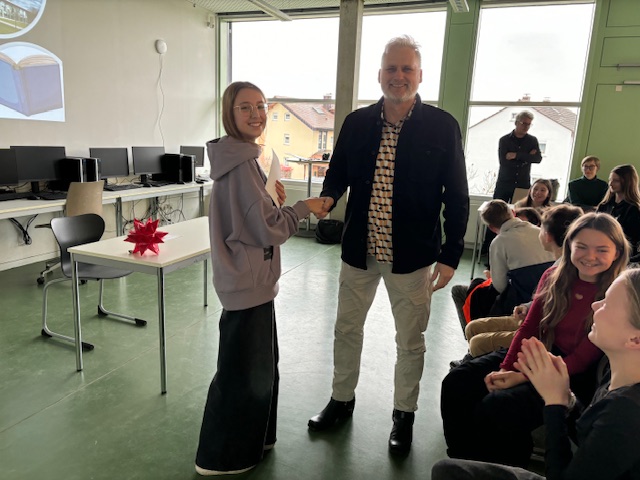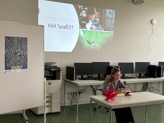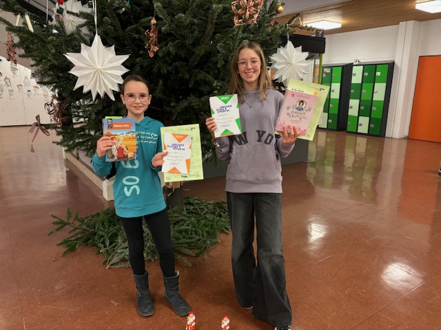 Herzlichen Applaus und große Anerkennung gab es beim Schulentscheid des Vorlesewettbewerbs am vergangenen Donnerstag für die beiden Finalistinnen Emilia Lorth aus der 6a und Zoe Veidt aus der 6b. Beide Schülerinnen lasen zunächst einen vorbereiteten Text und beeindruckten ihre Klassenkameraden und die Jury durch flüssiges Vortragen und die angenehme Art den jeweiligen Inhalt ihrer Geschichten zu betonen. Emilia Lorth las aus Kerstin Giers Jugendroman “Rubinrot”. Zoe Veidt aus “Die drei Ausrufezeichen – Abenteuer Afrika“ von Kirsten Vogel. Auch beim anschließenden Vortrag eines unbekannten Textes herrschte gespannte Stille unter den Anwesenden. Nachdem die Jury sich beraten hatte, gab Kilian Laug die diesjährige Schulsiegerin Emilia Lorth bekannt. Er gratulierte im Namen der Schulleitung beiden Schülerinnen herzlich und überreichte zwei Buchpreise sowie die Urkunden. Das Anne-Frank-Gymnasium drückt Emilia die Daumen für das Kreisfinale im Frühjahr.