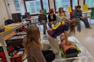 Der Kurs umfasste typische Einsatzsituationen, die im Schulalltag auftreten können: Schnittwunden, kleinere Sportunfälle, Nasenbluten oder plötzliche Kreislaufprobleme. Darüber hinaus lernten die Nachwuchssanitäter auch den professionellen Umgang mit ernsten Notfällen wie zum Beispiel Fingeramputationen, Bewusstlosigkeit und einem Herz-Kreislauf-Stillstand. Dabei konnten sie nicht nur ihr Wissen erweitern, sondern auch praktische Fähigkeiten trainieren, die im Ernstfall entscheidend sein können. So übten sie die stabile Seitenlage, Herzdruckmassage und den Umgang mit dem AED.