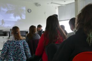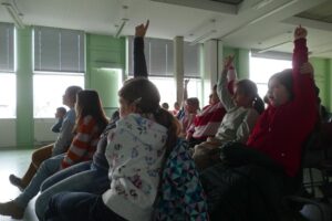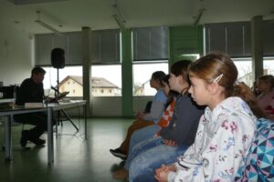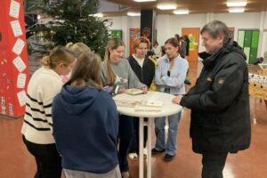 Markus Orths stellte in den Klassen 5 und 6 seine beiden erfolgreichen Bücher „Crazy family“ und „Badabamba und die Insel der Zeit“ vor. Geduldig beantwortete er anschließend alle Fragen zu den mitgebrachten Büchern und seinem Leben und Arbeiten als Schriftsteller. Darüber hinaus wurde klar, dass Orths sich viele Gedanken darüber macht, wie er die Figuren seiner Geschichten zeichnet und er seine kreativ-verrückten Einfälle durch Tipps aus der Lebenswelt der eigenen drei Kinder ergänzt. Vor allem aber schaffte er es die Schülerinnen und Schüler in die beiden Geschichten mitzunehmen, was die vielen interessierten Nachfragen zeigten. Bedauert wurde lediglich, dass der Autor „ausgerechnet an der spannendsten Stelle“ aufhörte zu lesen. In der großen Pause trafen sich Schülerinnen und Schüler der Oberstufe mit Markus Orths zum Gespräch. Mehr über Markus Orths erfahrt ihr auf www.markusorths.de.