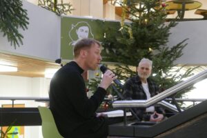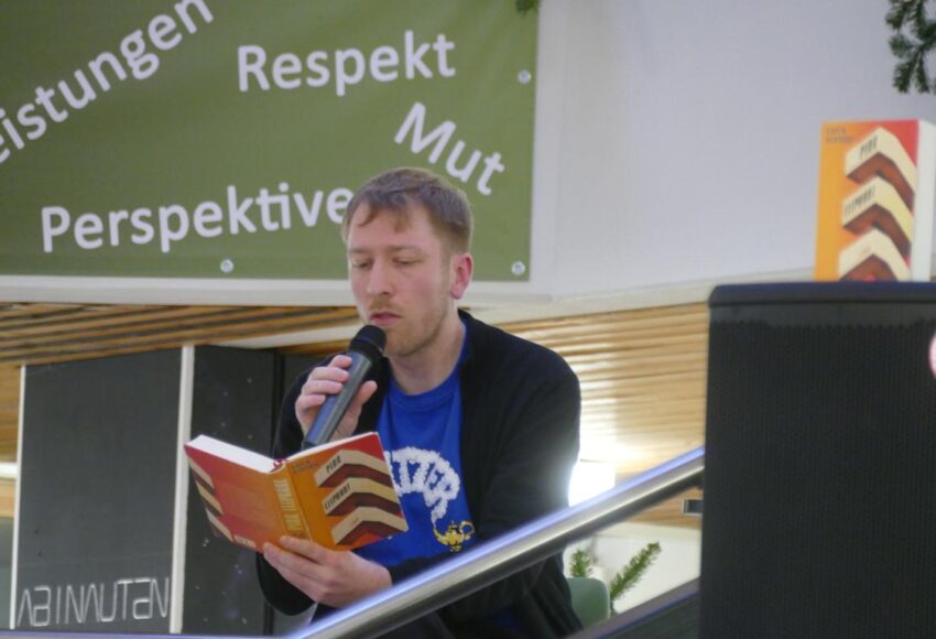Besonders lebendig wurde die Veranstaltung im anschließenden Gespräch: Die Schülerinnen und Schüler nutzten die Gelegenheit, eigene Fragen zu stellen – zum Roman, zum Autorenleben und zur Person Luca Kieser. Literatur wurde hier nicht als Pflichtstoff erlebt, sondern als lebendiger Dialog über Erfahrungen, Perspektiven und Haltung. Die Offenheit und Authentizität des inzwischen in Wien lebenden Autors sorgten für eine Atmosphäre des Austauschs auf Augenhöhe. So beantwortete Kieser die Frage, wie viel man den als Schriftsteller verdiene, ehrlich: Lediglich 10% des Buchpreises gehen an den Urheber. Allerdings tragen auch Lesungen und Auszeichnungen zum Verdienst bei. Kieser hat dieses Jahr bereits das mit 18.000€ dotierte Kranichsteiner Kinder- und Jugendliteratur-Stipendium und jetzt im Dezember das Aufenthaltsstipendium 2026 des Stuttgarter Schriftstellerhauses e.V. erhalten. Die Frage, ob er zum Schreiben KI nutze, verneinte Luca Kieser. Zum einen seien die Ergebnisse zu schlecht, außerdem gibt es eine Verzichtsklausel im Vertrag mit dem Verlag.